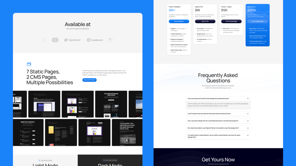 - 10 static pages (Home, Home v2, Home v3, Framer Template, Figma UI Kit, Components, Pricing, How to, FAQ, Contact)